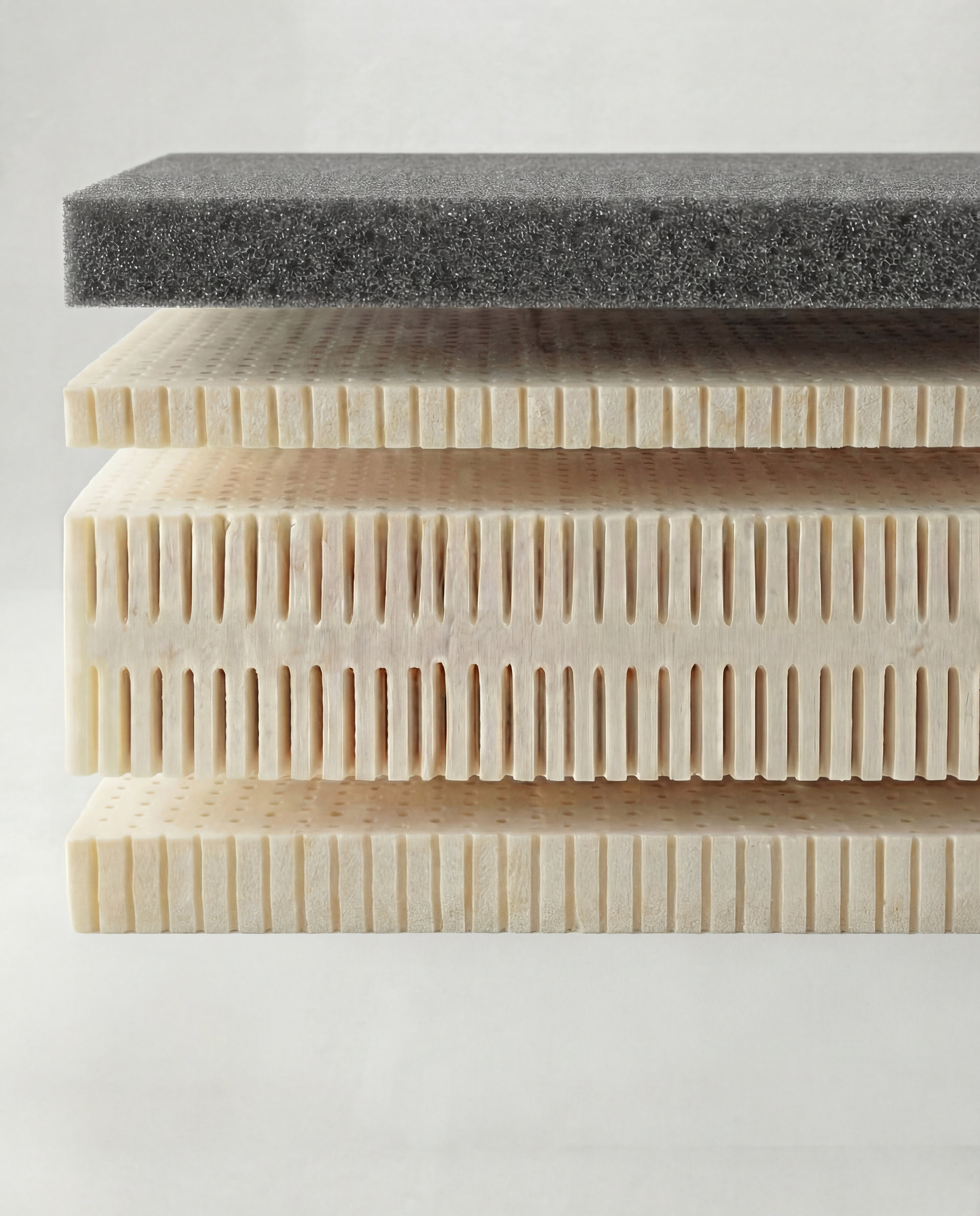 A sua grande diferenciação reside na superfície perfurada de densidade. Esta arquitetura específica, pontuada por centenas de canais de ventilação, confere ao material uma suavidade superior, permitindo que se molde aos contornos do corpo com uma delicadeza que o látex em bloco não consegue atingir.